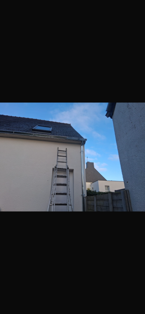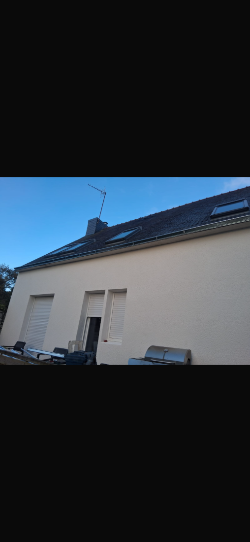 Chantier finalisé à Saint-Renan : ravalement complet des façades avec peinture D3i4 et remplacement des gouttières, offrant à la maison une protection durable et un aspect rénové.